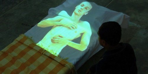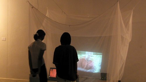 laptop and a small video projector projecting through a mosquito net making