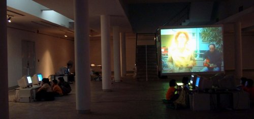 art projects at CMU Art Museum's exhibition hall. On the large screen,