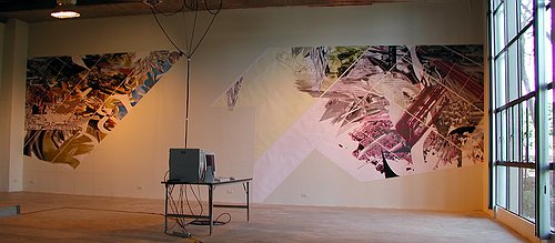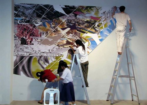 from the various works were printed and placed in a collage on the walls