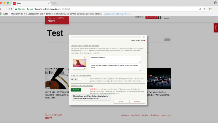 Es öffnet sich der Editor, über den Sie Ihre Beiträge anlegen und verwalten. Er leitet Sie durch alle Funktionen, die Sie bei der Anlage eines Blogbeitrags benutzen können. Die Beiträge erscheinen auf der Startseite des Kulturservers NRW in der Reihenfolge ihres Erstellungsdatums. Sie sind filterbar nach Stichwörtern aus Titel und Text, Kategorie sowie Tags.