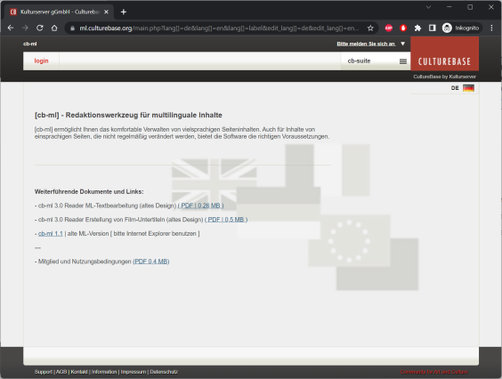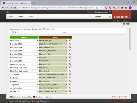 Der CultureBase-MultiLanguage-Editor ist ein Redaktionssystem für alle Textbereiche, die nicht aus datenbankgestützten Bereichen kommen (Bsp.: Navigationspunkte, Hilfetexte, Impressum u.a.). Jede Sprache ist in eine statische Seite eingebettet – die ganzen Informationen können nun mit einer einzigen Abfrage dargestellt werden.
