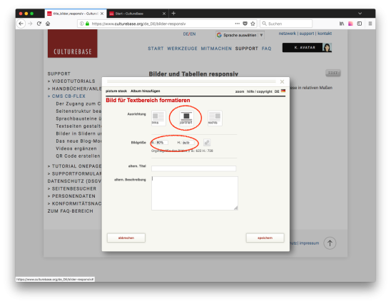 Entsprechend können Sie mit 80% oder 50% kleine Formate positionieren. Die Höhe wird hierbei automatisch stets auf "auto" eingestellt. Nun berechnet das Programm automatisch die entsprechende Höhe des Bildes ohne die Seitenverhältnisse in Abhängigkeit zu Darstellungssituation zu verändern.