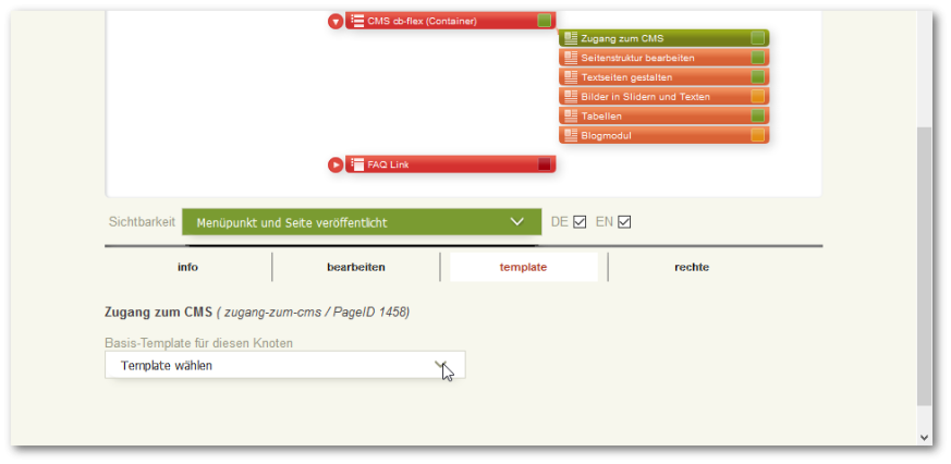 Der Reiter „template“ enthält nur bei einigen Projekten eine Auswahl – zum Beispiel bei Websites, die sehr unterschiedlich gestylte Bereiche haben. Hier können die Redakteure neuen Seitenbereichen das Template mit dem gewünschten Layout zuweisen.