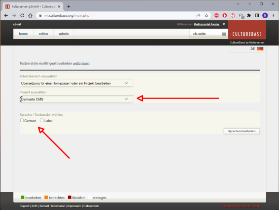 Geben Sie acht, das das richtige Projekt ausgewählt ist. Sollten Sie ihr Projekt nicht finden, bedeutet dass, das sie nicht die richtigen Rechte haben. Achten Sie außerdem das Sie alle relevanten Sprachen/Textbereiche angeklickt haben, sonst können Sie diese nicht bearbeiten. Sie müssen nicht alle anklicken. Die entsprechenden Sprachen also bitte in der Auswahlbox "anhaken".