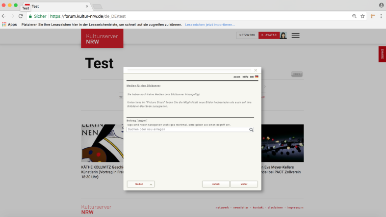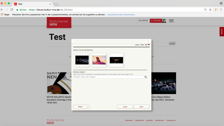 Nach dem Klick auf „weiter“ erhalten Sie in der nächsten Maske die Möglichkeit, Bilder im Banner oberhalb des Beitrags einzufügen.