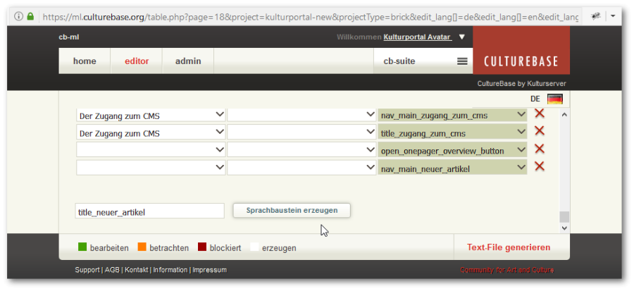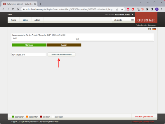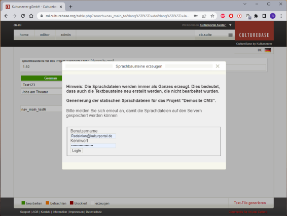 Um ein Sprachlabel bearbeiten zu können, müssen Sie es zunächst in das CultureBase-Werkzeug cb-ml (in der Controlbar verlinkt) übertragen. Dies geht, indem Sie das Label in cb-ml unten ins Feld neben „Sprachbaustein erzeugen“ tippen oder kopieren und anschließend den Link „Sprachbaustein erzeugen“ drücken. Nun erscheint das neue Label in der rechten Spalte von cb-ml, und Sie können seine Übersetzungen in den gewünschten Sprachen eingeben. Nach dem Speichern klicken Sie unten rechts im cb-ml-Fenster auf „Textfile generieren“. Es erscheint ein Fenster, in dem Sie Ihren Nutzernamen und Ihr Passwort eingeben und bestätigen müssen.
