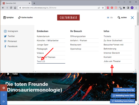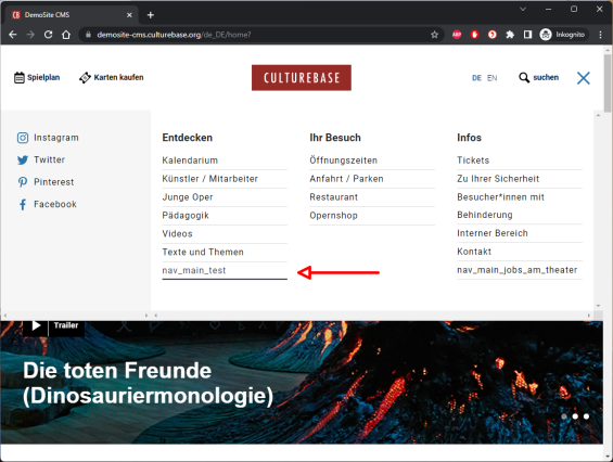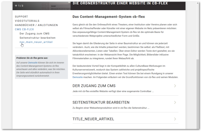 Hinweis: Je nach Seitentyp wird auf der Webseite per Klick auf den Hauptnavigationspunkt eine URL der 2. oder 3. flex-Ebene angewählt.