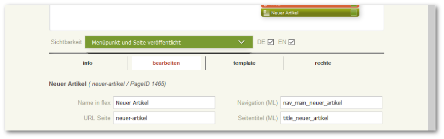 Ein neuer Menüpunkt erscheint auf der Website zunächst in Form eines sogenannten Sprachlabels, ebenso der Titel der Seite:
