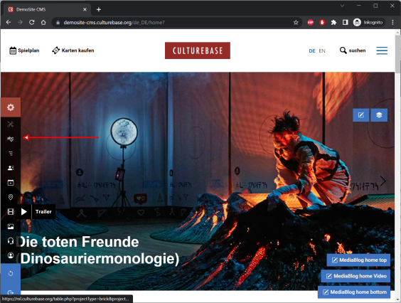 Jede mit cb-flex erstellte Website verfügt über eine sogenannte Controlbar, die für normale Seitenbesucher unsichtbar ist und auch für Sie als Redakteur mit Administrationsrechten nur in eingeloggtem Zustand nutzbar ist. Das Einloggen ins CMS erfolgt über einen Login-Button oder die versteckte Controlbar mit Ihrem CultureBase-Account.