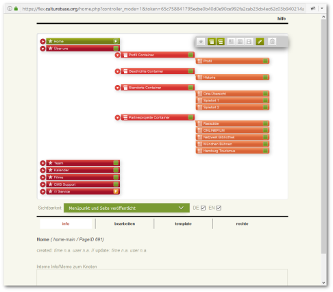 Sie können hier auch für jeden Knoten bestimmen, ob er auf Ihrer Website sichtbar (grüne Markierung im Knoten), unsichtbar (rot) oder nur per Link (gelb) zu erreichen ist. Neue Knotenpunkte stehen in cb-flex zunächst automatisch auf unsichtbar. In der Sichtbarkeitsleiste können Sie den Status ändern, wenn Sie den Knoten oben im Baum per Klick markiert haben.