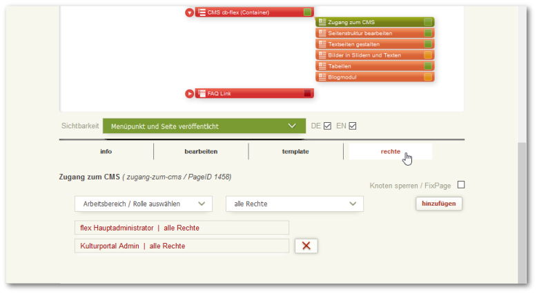 Unter dem Reiter „rechte“ können für unterschiedliche Personenkreise Rechte vergeben werden. Dies betrifft insbesondere Seiten mit einem mehrstufigen Redaktionsrechtesystem. Außerdem können weitere Berechtigungen über „Berechtigungen hinzufügen“ angelegt werden. Über „Konten sperren / Fixpage“ wird ein Menüelement fixiert, sodass es nicht mehr gelöscht werden kann. Dies erkennt man an einem „F“ im Sichtbarkeitskästchen des Knotens im Menübaum.