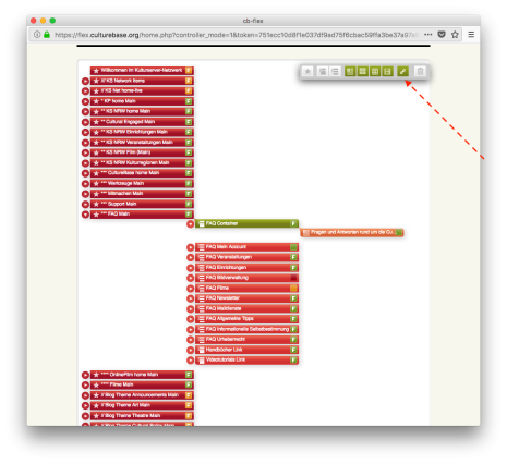 Wenn Sie nach dem Einloggen in der Controlbar den Link „flex“ anklicken, sehen Sie den Strukturbaum Ihrer Website in cb-flex in einem gesonderten Fenster. Er befindet sich zunächst im geschlossenen Zustand. Durch Klick auf die kleinen Pfeile ganz links öffnen Sie die Unterstruktur der einzelnen Hauptknoten.