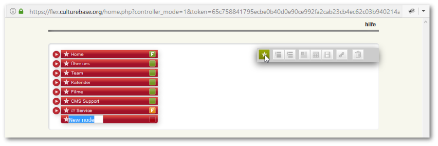 Auf der ersten Ebene legen Sie das Hauptmenü Ihrer Website an. Wenn kein Element des Strukturbaums markiert ist (alle Ordnerelemente sind dann dunkelrot), ist in der Werkzeugleiste das Stern-Icon aktiv (grün).