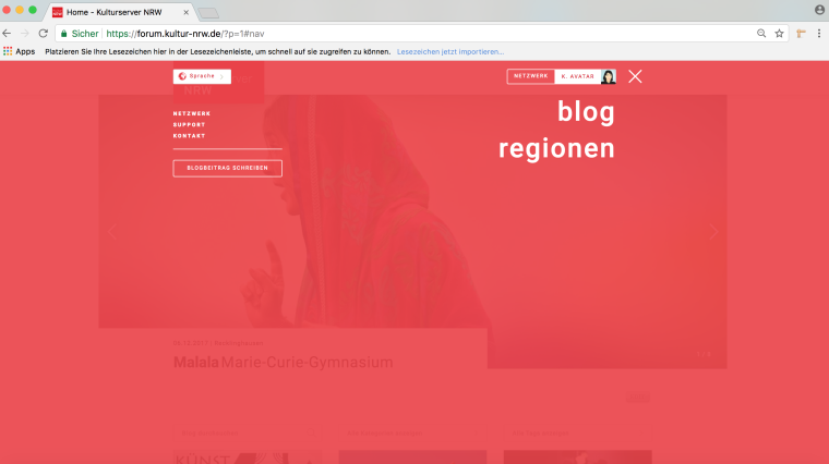 Loggen Sie sich auf dem Portal über den Login-Button mit Ihrem CultureBase-Account ein. Um z. B. auf Kulturserver NRW einen Blogbeitrag anzulegen, öffnen Sie das Menü über das Menü-Icon oben rechts und klicken dort auf „Blogbeitrag schreiben‘‘.