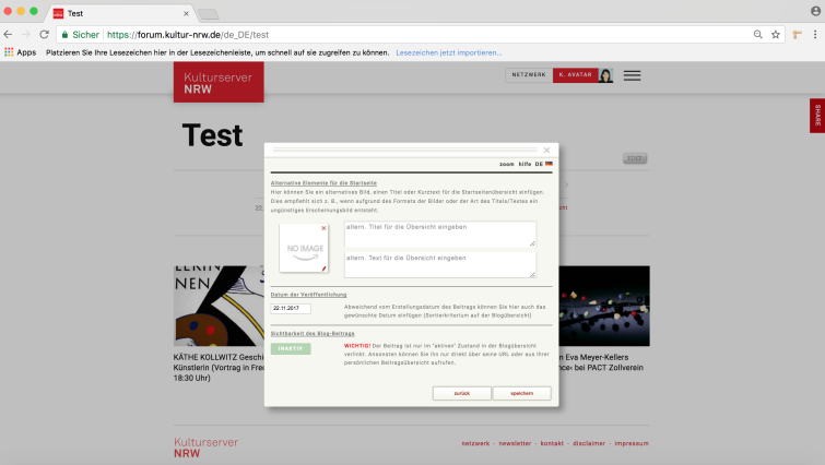 Automatisch werden Titel, das erste Bild und der Textanfang als sogenannter Teaser auf der Startseite angezeigt. Sie können in der dritten Eingabemaske jedoch ein alternatives Bild, einen Titel oder Kurztext fur die Startseitenübersicht einfügen. Dies empfiehlt sich z. B., wenn aufgrund des Formats der Bilder oder der Art des Titels/Textes ein ungünstiges Erscheinungsbild entsteht. Datum der Veröffentlichung Automatisch wird im Beitrag das Erstellungsdatum des Beitrags angezeigt. Im Editor kann es jedoch überschrieben werden. Dieses manuell eingetragene Datum erscheint dann nicht nur im Beitrag, sondern sortiert den Beitrag auch entsprechend auf der Startseite ein. Status der Veröffentlichung Ihr Beitrag ist nur im aktiven Zustand in der Blogübersicht zu sehen. Denken Sie daran, ihn hier auf „aktiv“ zu setzen, wenn er fertig ist.
