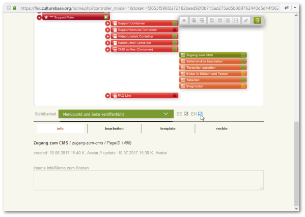 Im Bereich „bearbeiten“ unter der Sichtbarkeitsleiste können Sie den Namen eines Knotens in cb-flex sowie seine URL verändern, ebenso die Meta Description für SEO eintragen und ml-Bausteine für „Navigation“ und „Seitentitel“ bearbeiten. Diese Elemente werden beim Anlegen des Knotens automatisch festgelegt.