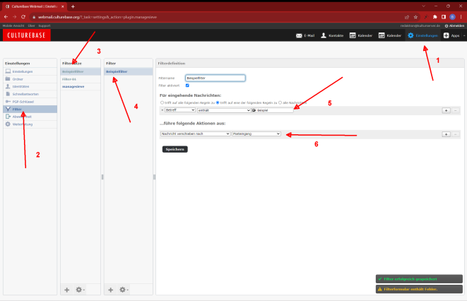In verschiedenen E-Mail-Clients wie Thunderbird sowie im Culturebase-Webmailer steht Ihnen die praktische Funktion zur Verfügung, eingehende E-Mails direkt zu filtern. Das bedeutet, dass Sie beispielsweise alle Nachrichten mit einem bestimmten Stichwort im Betreff, wie beispielsweise 'Buchhaltung', automatisch in den entsprechenden Ordner 'Buchhaltung' verschieben können.