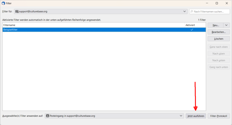 Thunderbird funktioniert im Grunde gleich. In den Einstellungen können Filter aktiviert, erstellt und konfiguriert werden.Anders als in webmail.culturebase.org, können Filter hier jedoch rückwirkend angewendet werden. Damit erweitert sich die Funktion von Filtern, auch zu einem „Aufräum-Tool“.