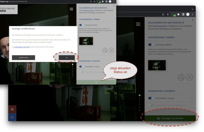 On the one hand, you can control the publication of your OnePager directly in the editor itself. There is a green button for this function at the bottom right