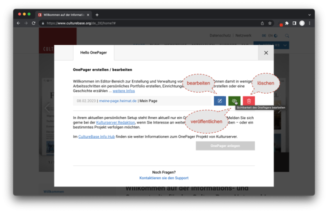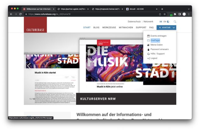 For example, go to the website where you created the OnePager. After logging in, you will find "OnePager" listed in the user menu or user panel. A window will open with the basic information and basic options. If in doubt, you can also use the CultureBase Info Hub directly.